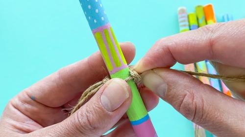 6. Legt oben eine ca. 5cm große Schleife und macht den ersten Knoten (mit zweifachem Garn). Wählt einen Abstand, nachdem eurer erster Stock befestigt werden soll und macht einen weiteren Knoten.