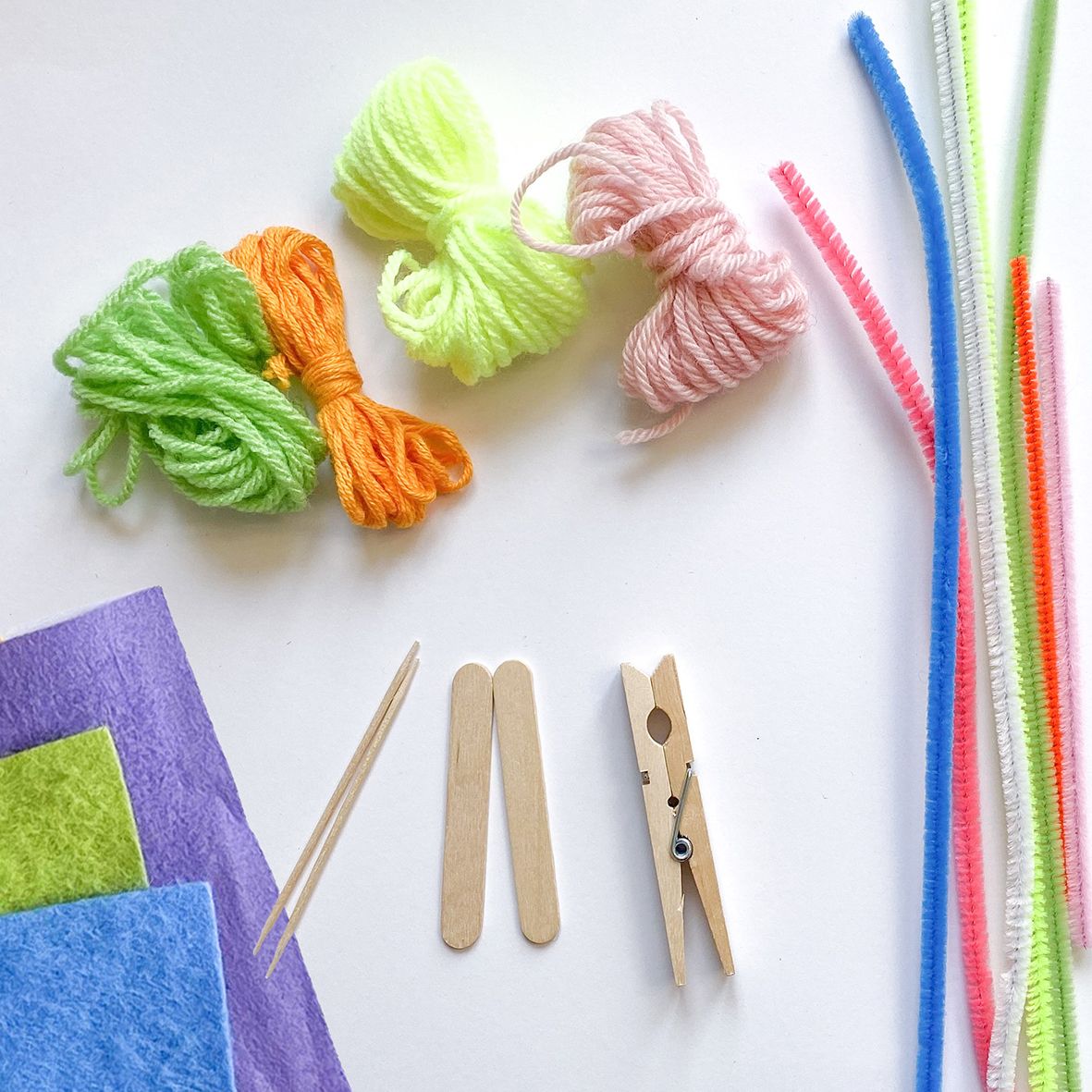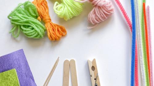 Für lange Haare wickelt ihr Wolle um eure Finger und bindet eine Seite mit einem weiteren Faden ab und verknotet ihn. Klebt die Frisur nun seitlich an die Wäscheklammer. Um die Haare hinter dem Kopf zusammen zu halten, haben wir einfach ein Stück Pfeifenreiniger genommen.