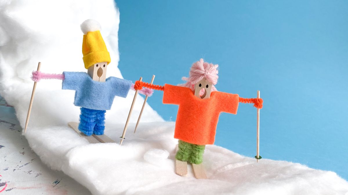 Für die Hose wickelt ihr den Pfeifenreiniger jeweils separat um die «Griffe» der Wäscheklammer und zwickt das Ende mit der Zange ab. Nun gebt ihr Heissleim auf die „Füsse“ und klebt diese an den Skiern (den Bastelhölzern) fest.
