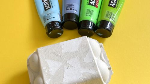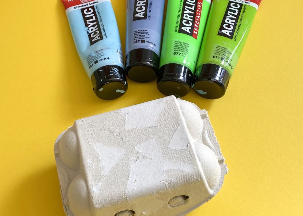 Entfernt zu Beginn das Etikett von dem Eierkarton, und bemalt diesen anschliessend in den Farben eurer Wahl aussen an. Wir haben unser Monster in blau-grün gehalten, aber ihr könnt zum Beispiel auch blau-lila, rosa-orange, etc. wählen. Wir finden jedenfalls, das Monster wirkt am Besten in mehreren Farben. Bemalt den Deckel und auch das untere Teil des Eierkartons, weil dieser hinterher nach unten aufklappt und das Kinn eures Monsters wird.