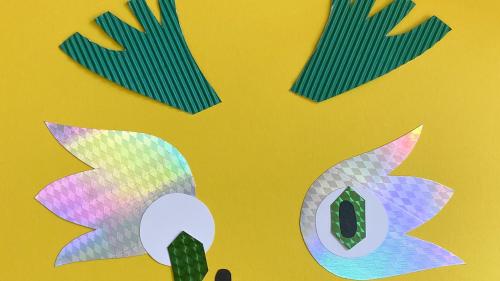 Schneidet nun die einzelnen Teile der Augen aus verschieden farbigen Papieren und Fotokarton aus. Denkt daran, den Augapfel weiss zu halten! Nutzt dafür die Schablonen, die ihr euch hier herunterladen könnt. Klebt die Teile der Augen zusammen und klebt die „Brauen“ mit etwas Distanz dahinter.