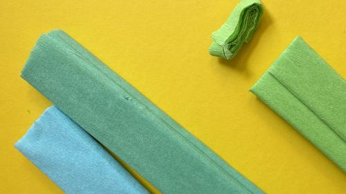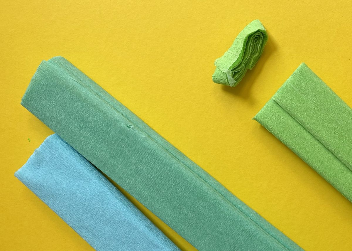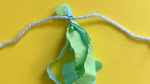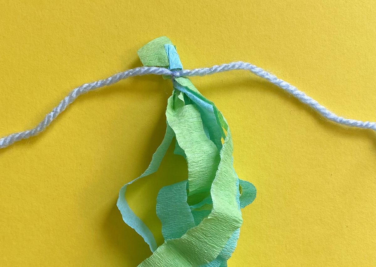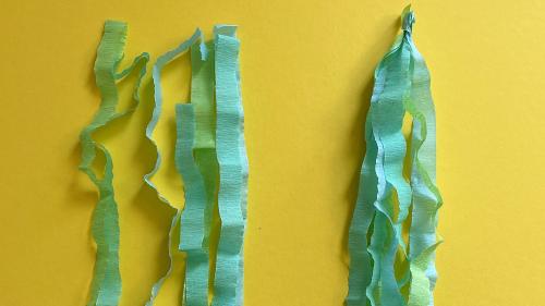 Für die Haare nehmt ihr nun das Krepp-Papier zur Hand und schneidet einen ca. 1cm breiten Streifen ab. Falls ihr kein Krepp-Papier zur Hand habt, könnt ihr auch einfach Wolle nehmen. Sowohl Krepp-Papier als auch Wolle bindet ihr oben zusammen und klebt sie von innen an dem Eierkarton fest.