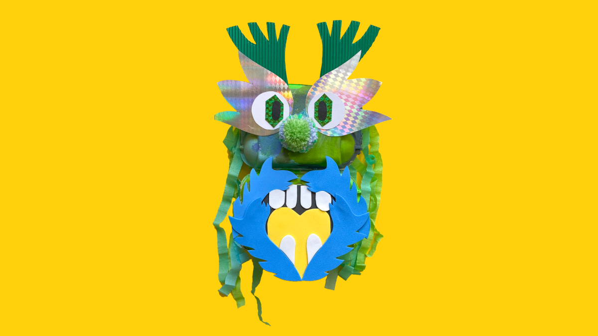 Zum befestigen an der Wand haben wir einen durchsichtigen Nylonfaden durch die Löcher im Deckel gezogen und Schwuppdiwupp schaut das Monster zu euch hinunter.