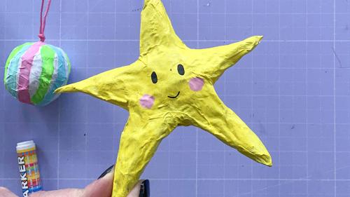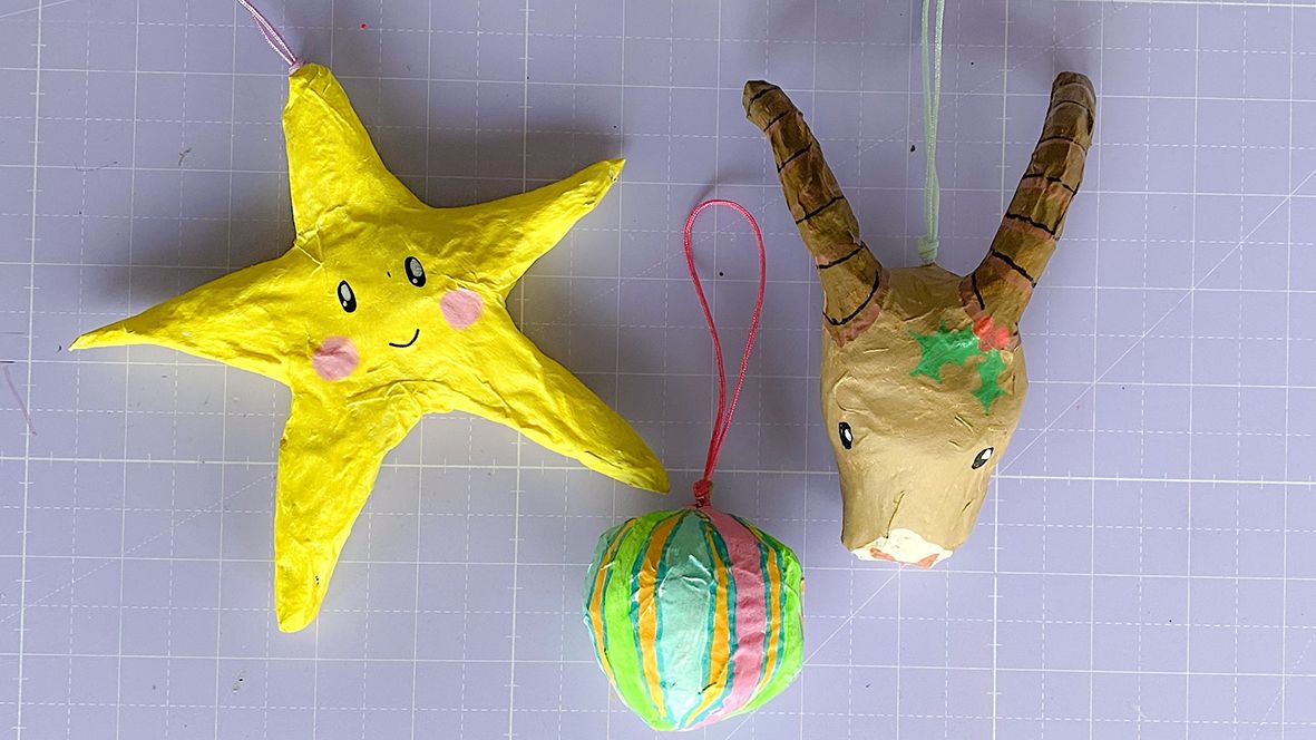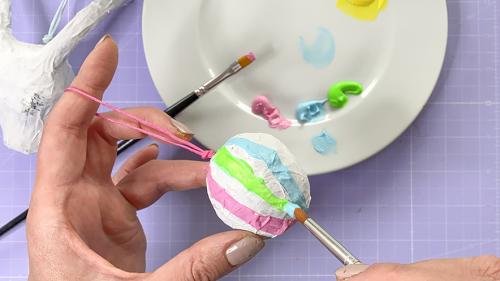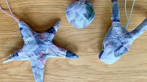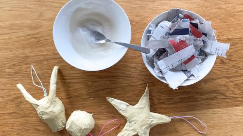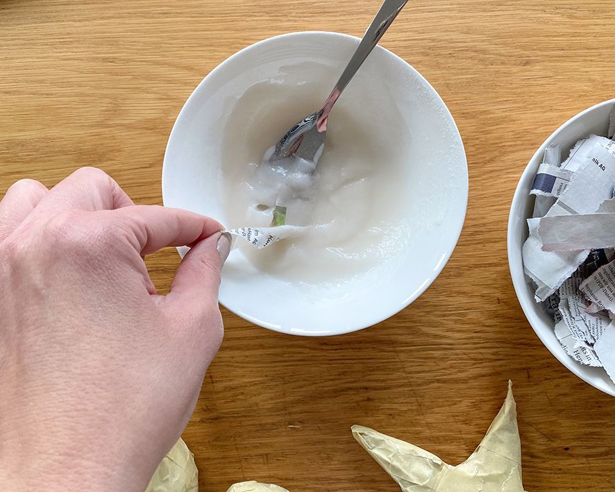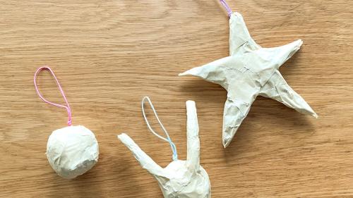 Hierfür braucht ihr nur etwas Papier (z.B. Füllmaterial aus Paketen, alte Zeitungen, etc.), Malerkrepp, Fischkleister, Acrylfarbe und einen Nylonfaden als Aufhänger.