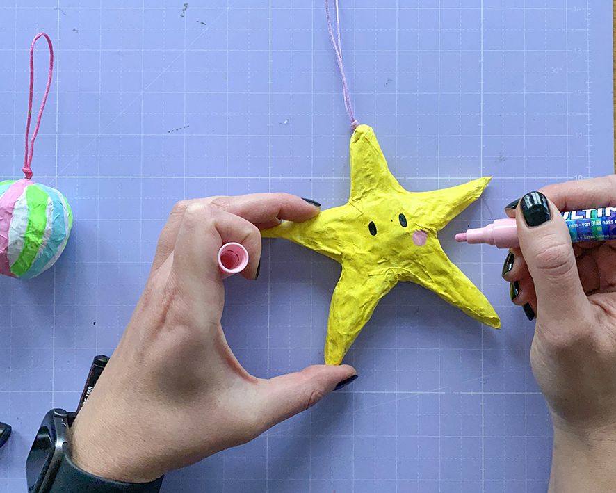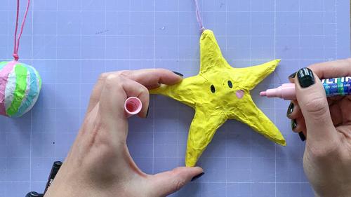 13. Für die letzten feinen Details nehmt ihr Acrylstifte Stifte zur Hand und malt damit Augen, Bäckchen und Hörner auf.