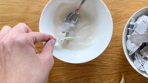 8. Zerreißt nun eine Zeitung in kleine Stücke und rührt den Fischkleister (Tapetenkleister) nach Packungsvorgabe an.
