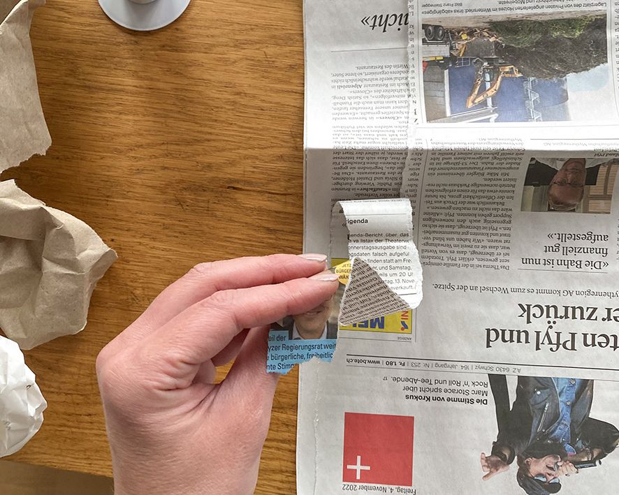 9. Jetzt tunkt ihr einen Papierschnipsel nach dem anderen in den Leim, streicht den überschüssigen Leim ab und beklebt eure Objekte komplett mit dem Papier. Eine Lage reicht.