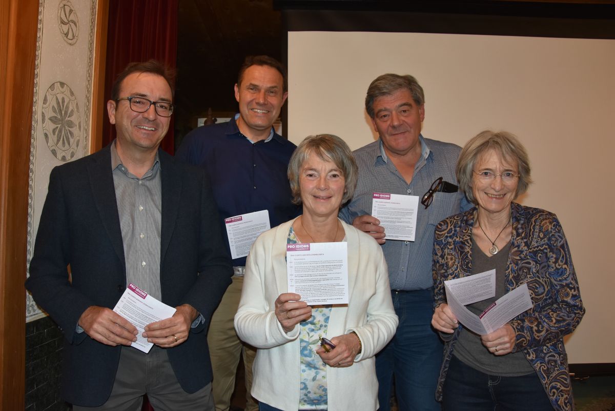 Han cumbattü ils ultims ons pels böts da la Pro Idioms. Da schnestra: Gian Nicolay, Domenic Toutsch, Anna Chatrina Brunold, Armon Parolini e Chatrina Urech (fotografia: Nicolo Bass).