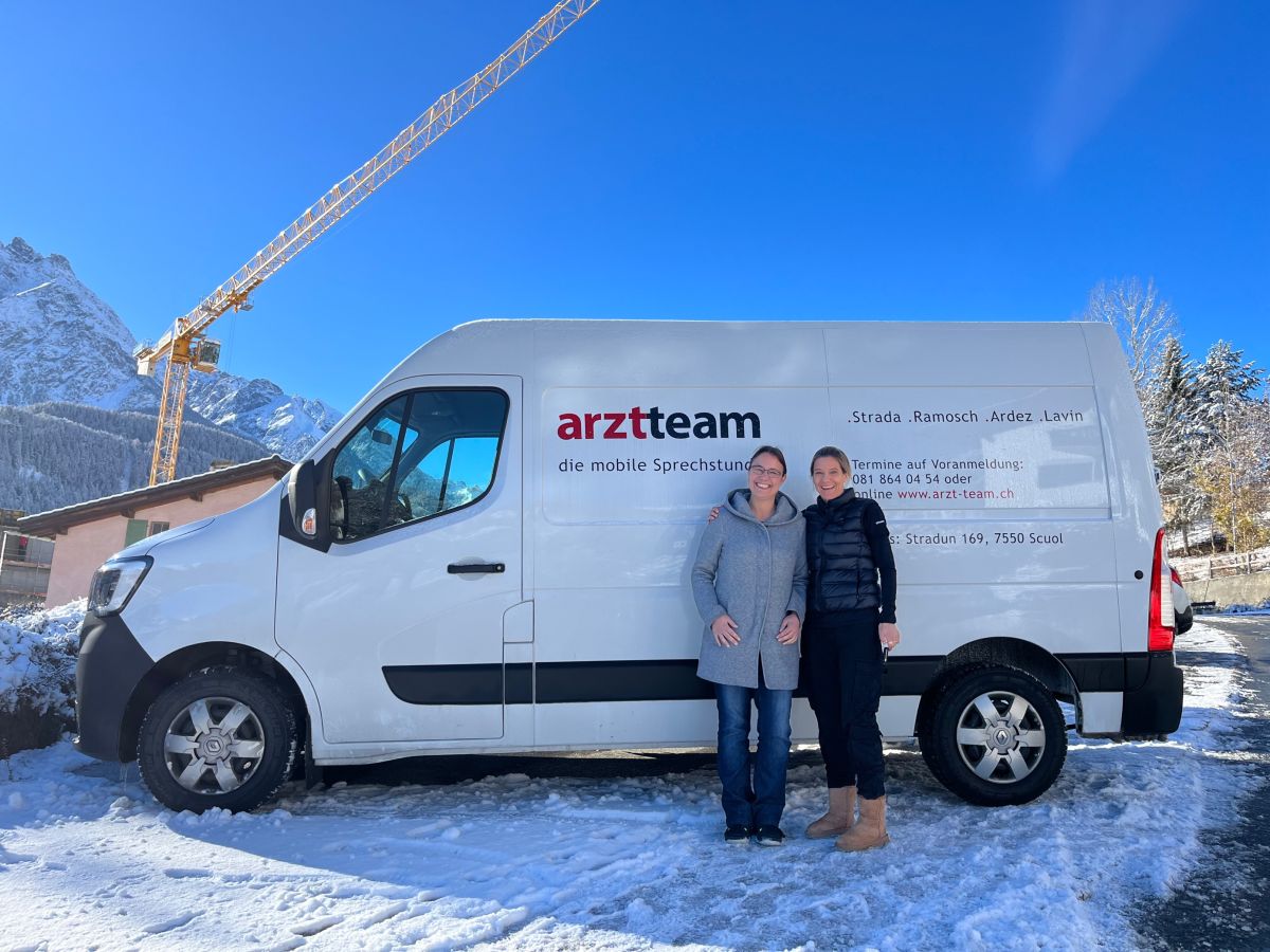 Annatina Taisch cun sia collavuratura Manuela Strimer davant il busin dad «arztteam engiadina» (fotografia: Martin Camichel).