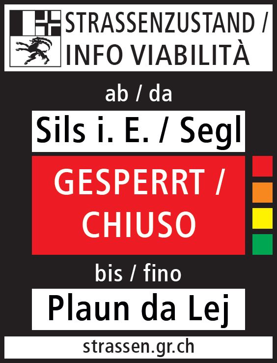 Zu diesem Zweck führt das TBA diesen Winter auf der Strecke Sils–Maloja ein Pilotprojekt durch: Ein geeignetes Informationssystem weist die Verkehrsteilnehmenden mittels Tafeln vor Ort bereits im Voraus über mögliche Sperrungen des Strassenabschnitts hin. Diese frühzeitige Anzeige von prognostizierten Sperrungen soll den Verkehrsteilnehmenden die Organisation ihrer Reise erleichtern.