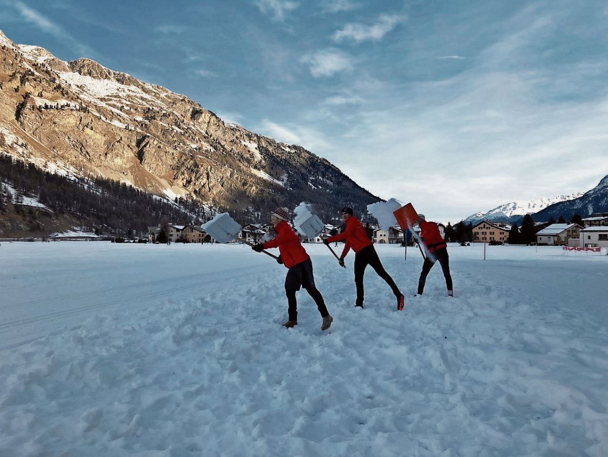 In Sils wurden die Loipen in Handarbeit mit Schnee präpariert, denn der ersehnte Neuschnee bleibt nach wie vor aus. Foto: Sils Tourismus