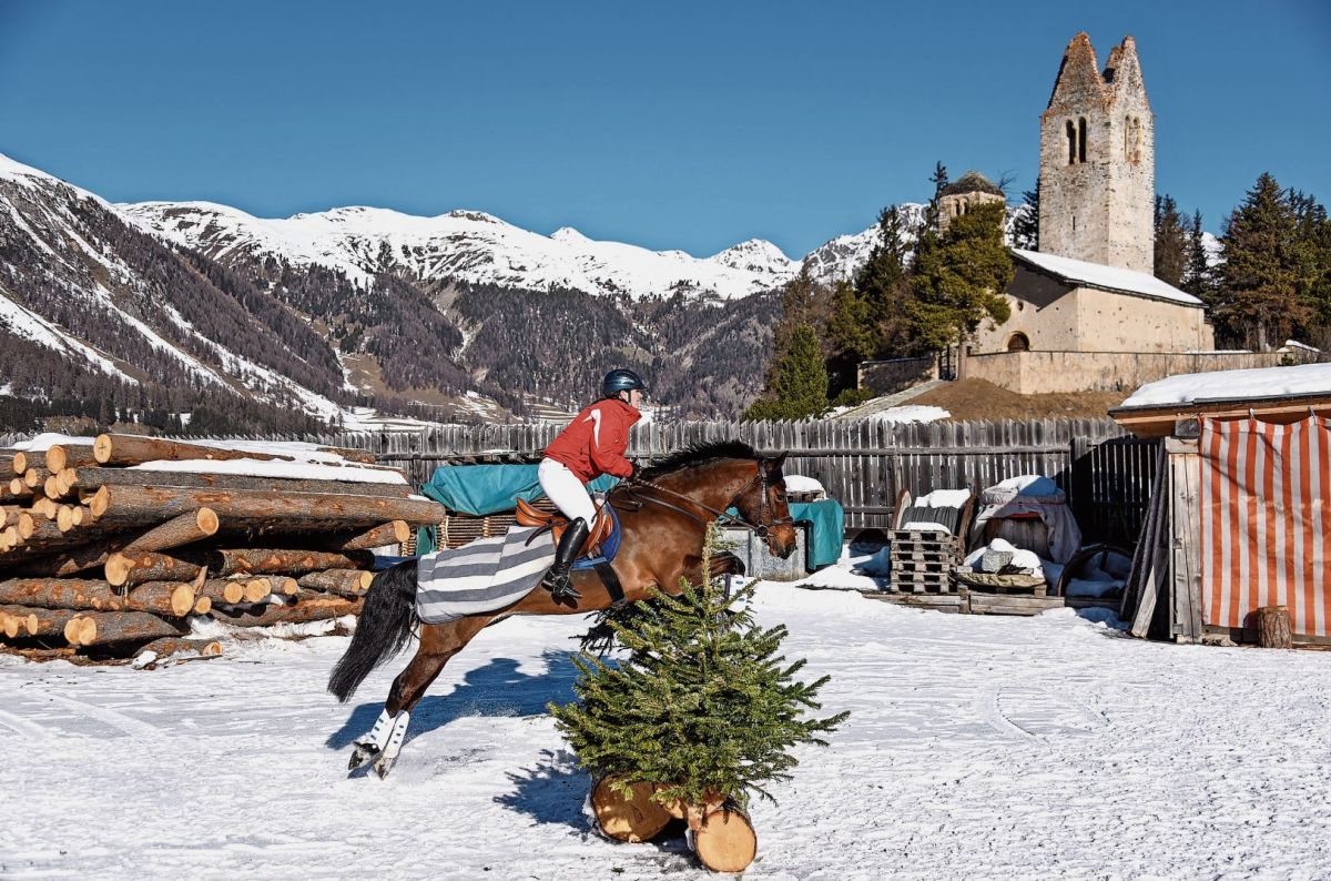 Bei der Kirche San Gian in Celerina findet das erste Springen des Horse Snow Cross statt Foto: z. Vfg