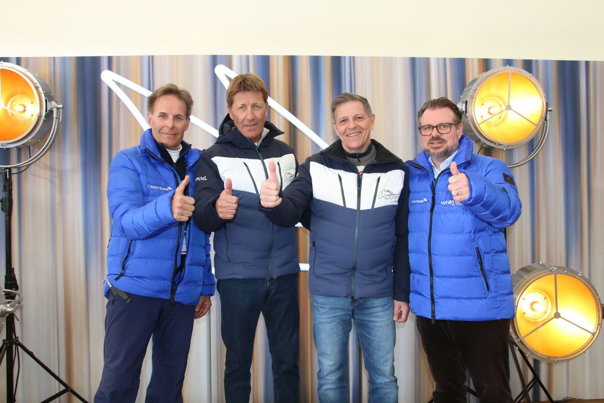 Lupo Wolf, Franco Moro und Köbi Broger mit Stephan Uebersax von der Credit Suisse, welche das Skijöring-Rennen seit Jahren sponsert. Foto: Christian Mettler