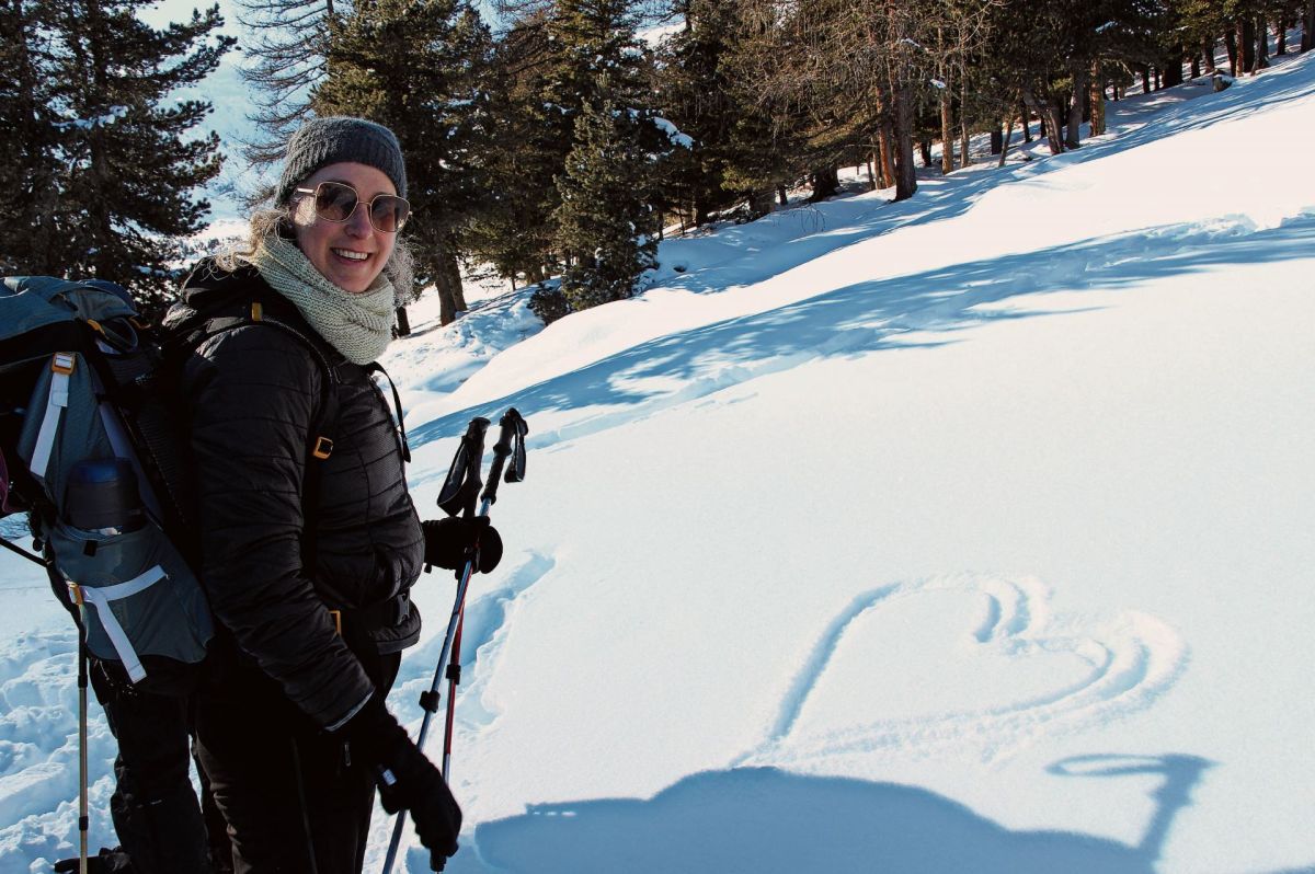Antonia Eisenhut malt ein Herz für die Natur in den Schnee.