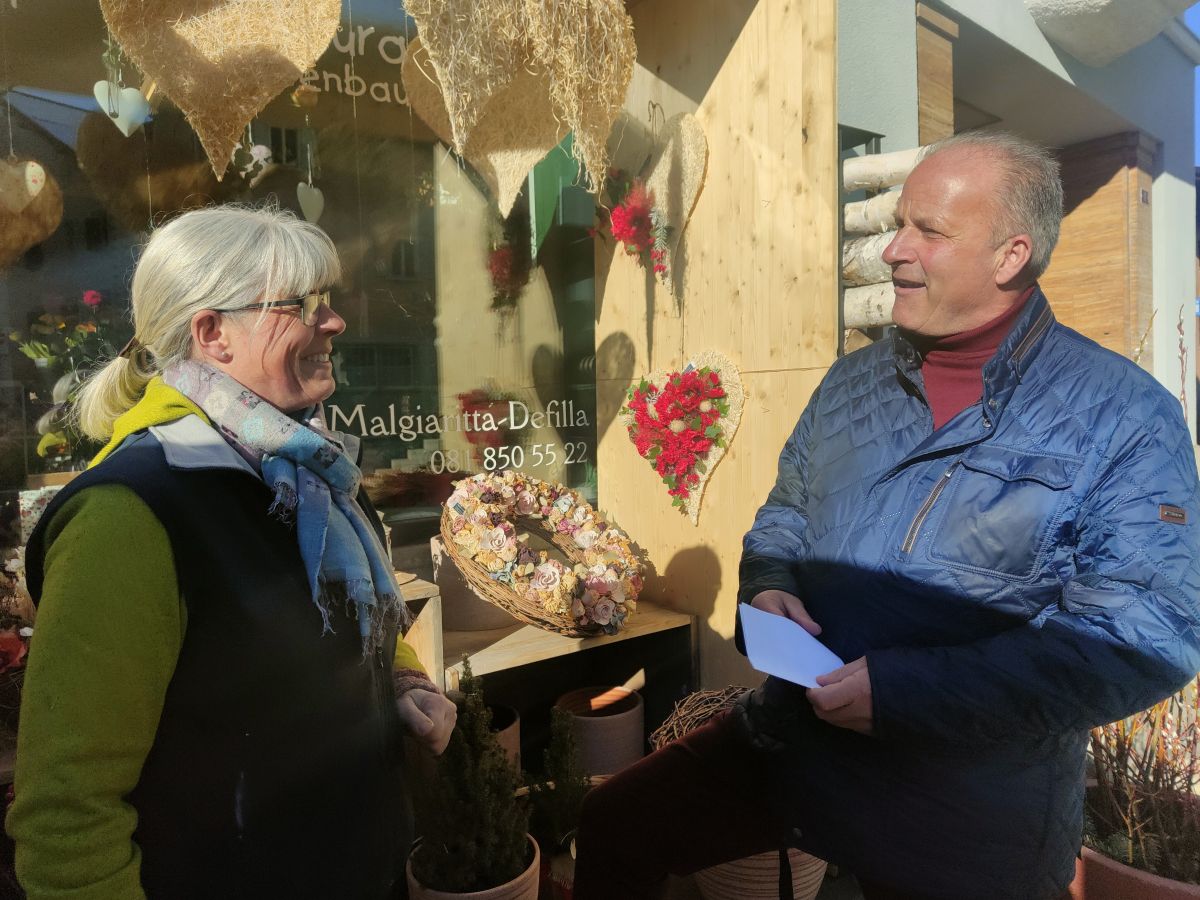 Gemeindepräsident Gian Peter Niggli im Gespräch mit der Floristin Brigitte Mettler, die das Blumengeschäft Malgiaritta Defilla in Samedan betreibt. Foto: Denise Kley