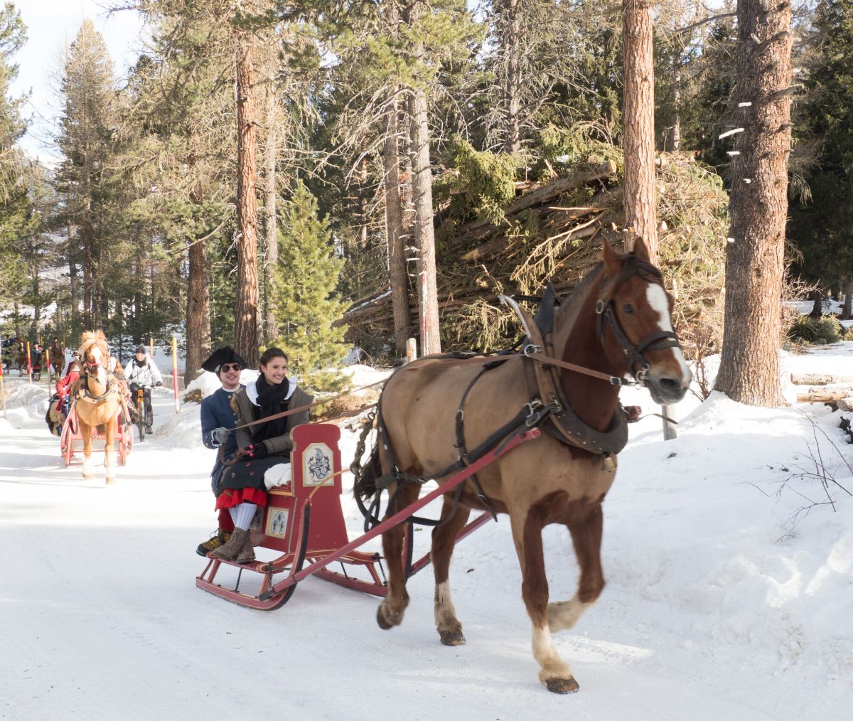 Die Schlittedas sind ein alter Brauch, welcher im Engadin jedes Jahr von den Giuventünas gelebt wird. Bei schönsten Bedingungen ist heute Samstag die Schlitteda der Giuventüna Samedan unterwegs. Nicht weniger als elf Schlitteda-Paare geniessen den Ausflug durch die Engadiner Landschaft.