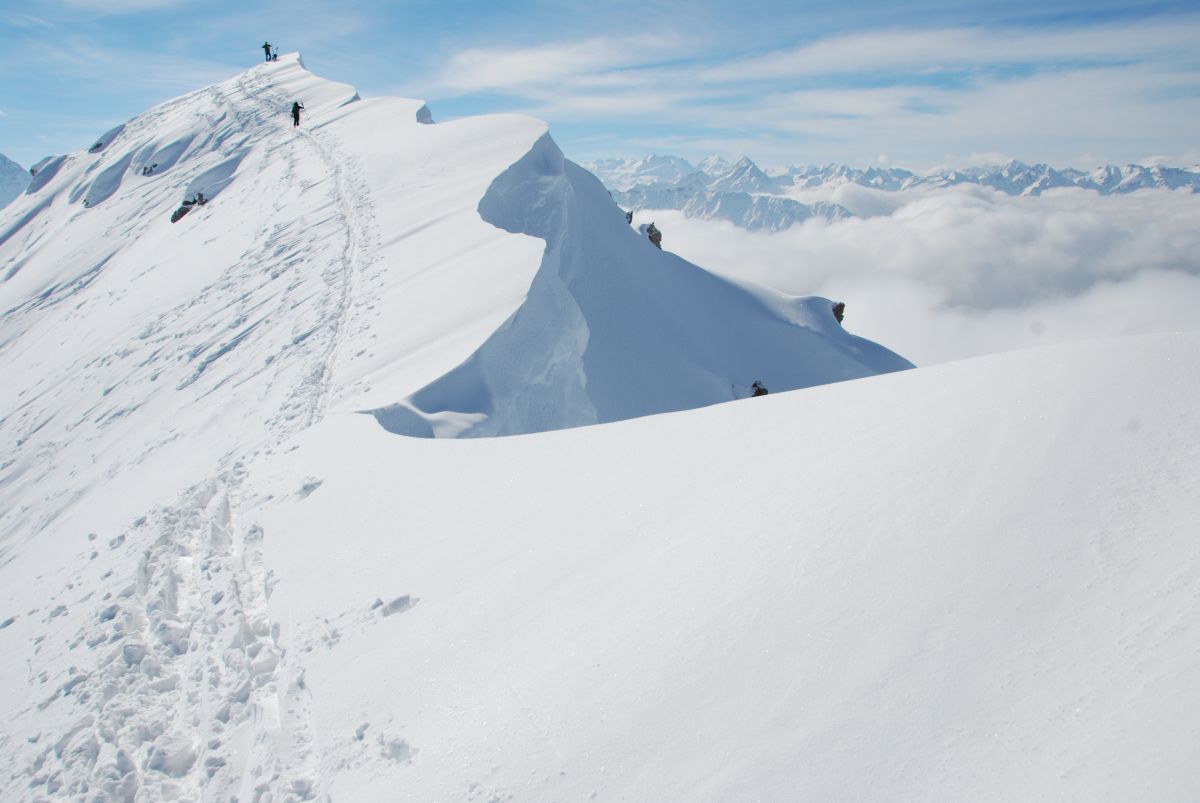 Skitourengeher und eine eindrückliche Schneewechte am 2808 Meter hohen Monsteiner Büelenhorn zwischen Davos Monstein und Bergün. Foto: Marcia Phillips/SLF