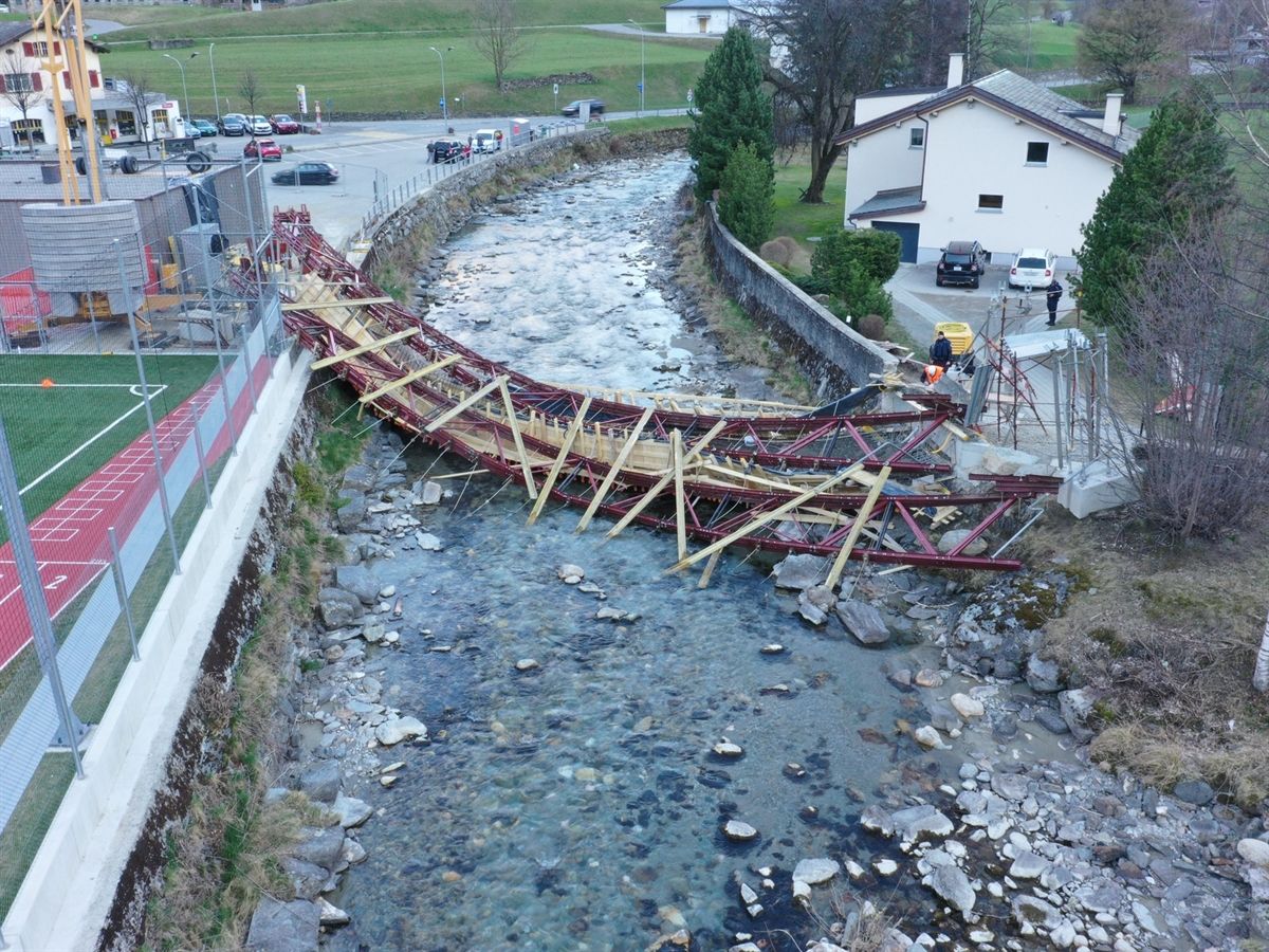Um 15.15 Uhr liess die im Aufbau befindliche Brücke für den Langsamverkehr zwischen dem Fussballplatz und der Via da Clalt nach. Auf der Brücke befanden sich fünf Arbeiter, allesamt italienische Staatsangehörige, welche mitsamt dieser in den Poschiavino stürzten. Bis auf einen konnten sich alle aus dem Trümmerfeld selbst befreien. Der Fünfte wurde durch die Rettungskräfte geborgen. Der Rettungsdienst Poschiavo nahm die ersten medizinischen Abklärungen von allen Verunfallten vor. Vier Arbeiter wurden ins Spital Poschiavo verbracht. Von dort aus wurde einer mit der Ambulanz ins Spital nach Samedan und einer mit der Rega ins Kantonsspital Graubünden nach Chur transportiert. Gemeinsam mit Spezialisten untersuchen die Staatsanwaltschaft und die Kantonspolizei Graubünden die genaue Ursache des Brückeneinsturzes.