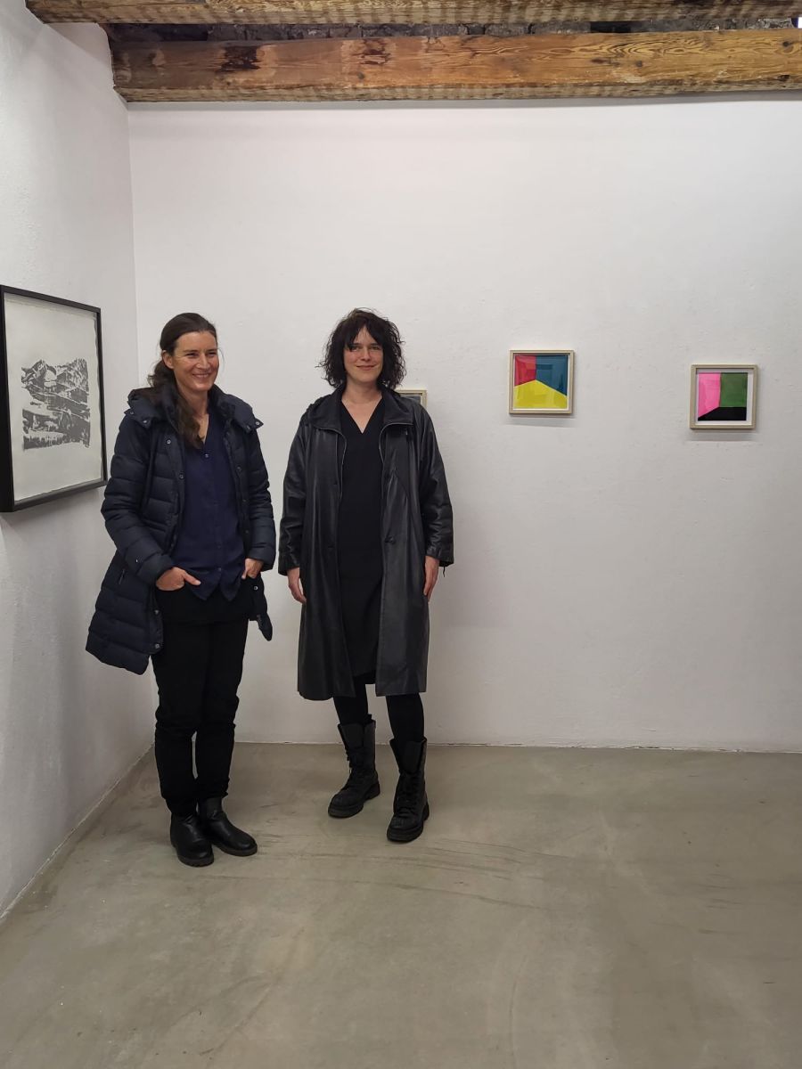 Laura Bott e Ginia Holdener davant ün squitsch da «legn» (2021/22) e la paraid cun spazis (2023). A dretta las ouvras «Spazi» (2023) e «Rabarber» (2022) da