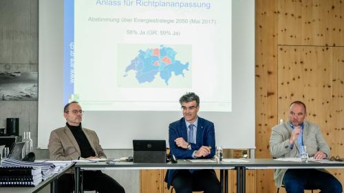 Jede Form der Energiegewinnung habe letztlich ihren Preis, argumentierte Volkswirtschaftsdirektor Caduff und ergänzte: «Die Produktionsanlagen stehen irgendwo in der Natur, weshalb wir eine Interessensabwägung zwischen Schutz und Nutzen vorzunehmen haben.» Eine solche sei mit dem Richtplan auf technischer Ebene durchgeführt worden, «jetzt folgt mit der öffentlichen Vernehmlassung die politische und gesellschaftliche Abwägung». Das Amt für Raumentwicklung (ARE) und damit auch Raumplanungsbelange sind im Departement für Volkswirtschaft und Soziales unter Marcus Caduff angesiedelt.