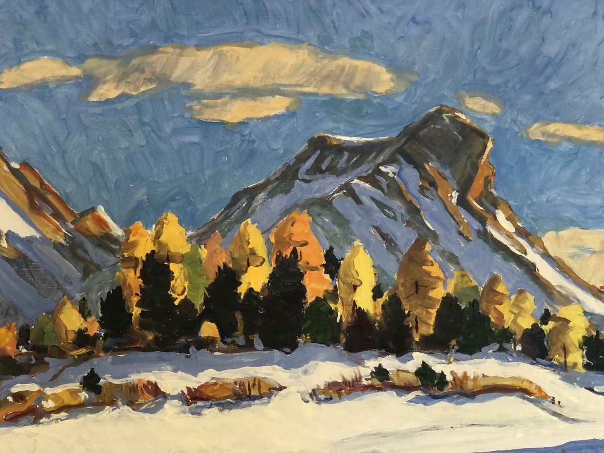 Ausschnitt aus einem grossformatigen Ölbild von Vitale Ganzoni, in welchem die Landschaft um den Piz Salecina im Zentrum steht. Foto: Marie-Claire Jur