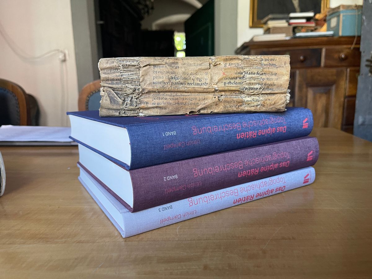 La publicaziun istorica da Durich Chiampell es gnida edida l’an 2021 in trais toms – in originel latin e cumbino cun üna traducziun tudas-cha (fotografia: Isabella Jaeger/RTR).
