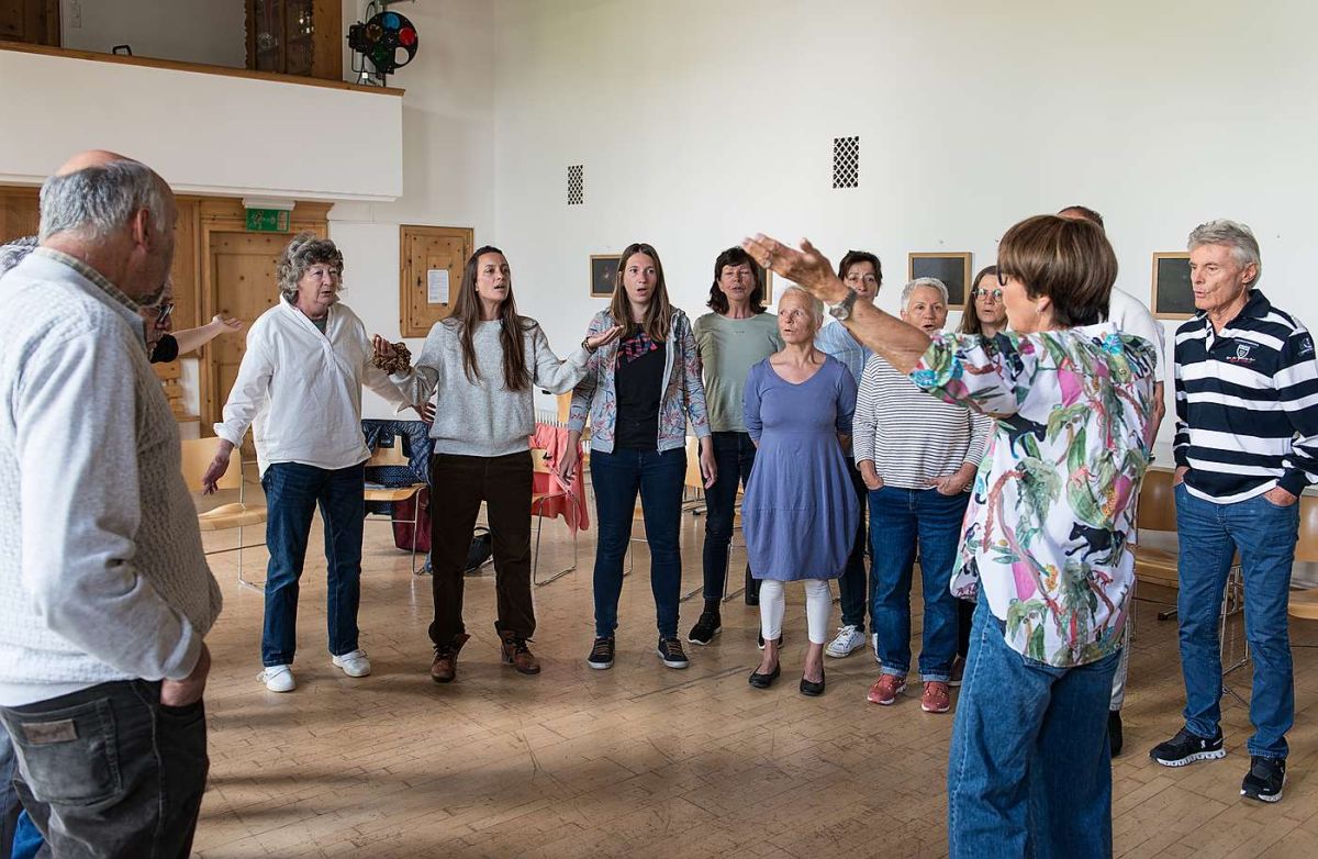 «Bäm bäm, bädä bäm bäm.» Bea Salzmann steht vor 15 Frauen und Männern des Oberengadiner Jodelchörlis. Sie instruiert. Sie korrigiert. Sie insistiert. Sie lobt. Sie kritisiert. Jetzt beispielsweise, wo das Jodelchörli den Einmarsch in den Vortragssaal übt. «Das geht gar nicht. Ihr könnt nicht einfach ‹reinschlarpen›. Das muss Zackzack gehen.» Rechtsumkehrt, und das Ganze noch einmal. «Viel besser, es geht doch», zeigt sich Bea Salzmann schon zufriedener.