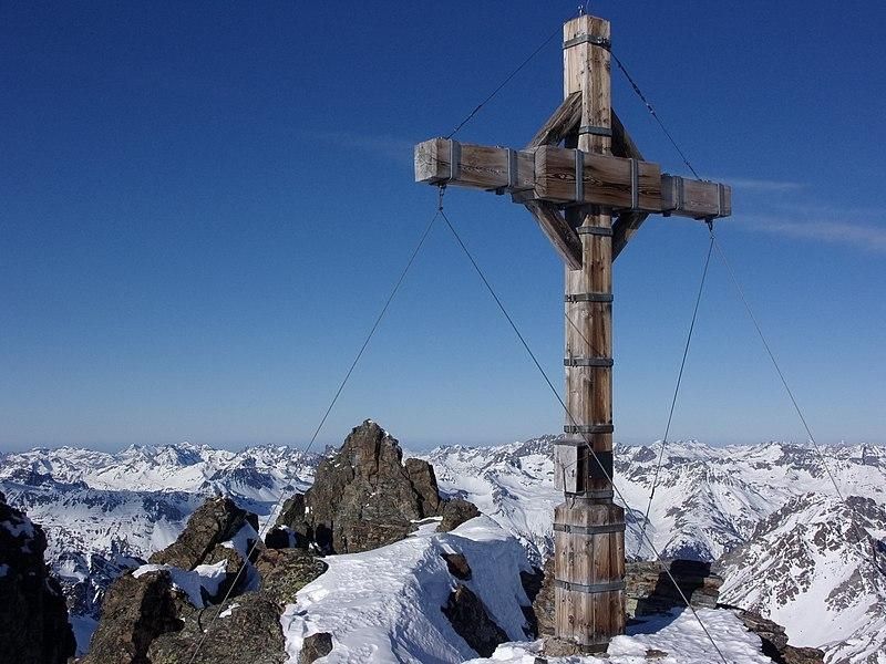 Il Piz Fenga, per tudais-ch Fluchthorn, es gnü ün pa plü bass, la crusch nun es neir na plü casü (fotografia: CC BY-SA 4.0).
