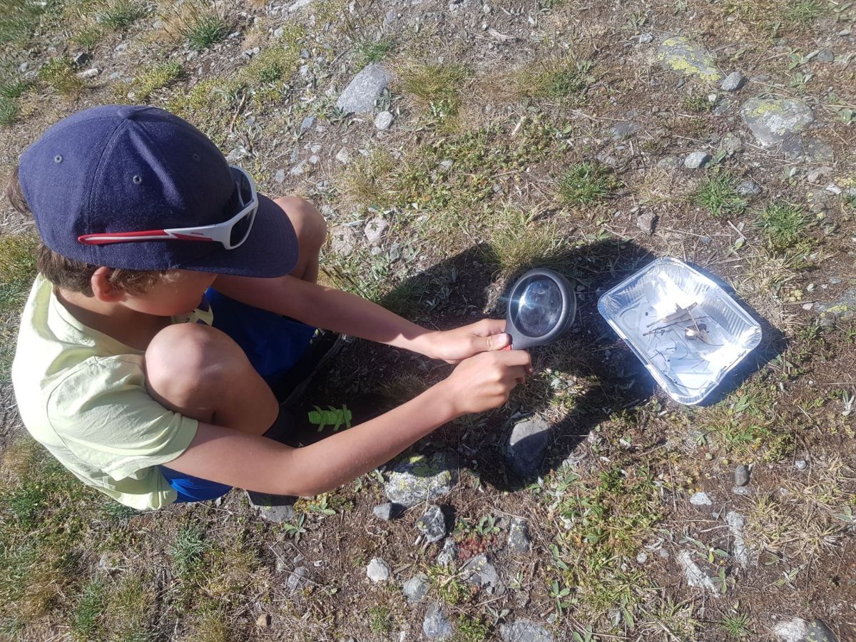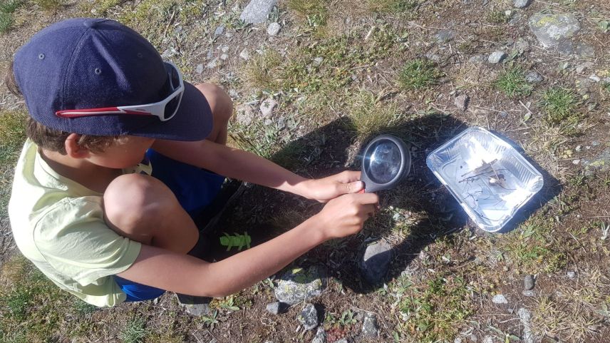 Dann kommt deine Lupe ins Spiel. Halte sie so in die Sonne, dass das Glas einen hellen Flecken auf die gewünschte Brennstelle wirft. Dieser helle Fleck sind die gebündelten Sonnenanstrahlen. Halte das Glas so, dass der Sonnenfleck direkt auf das Brennmaterial leuchtet. Bald beginnt es zu qualmen und dann lodern auch schon die ersten Flammen. Jetzt nimmst du etwas um dem Feuer frische Luft zuzufächern. So und nun die dürren Äste nachlegen - das Feuer brennt!