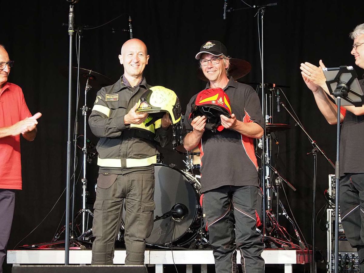 Elvio Porcedda und Daniel Büchi (rechts) tauschen ihre Feuerwehrhelme. Fotos: Nicolas Binkert