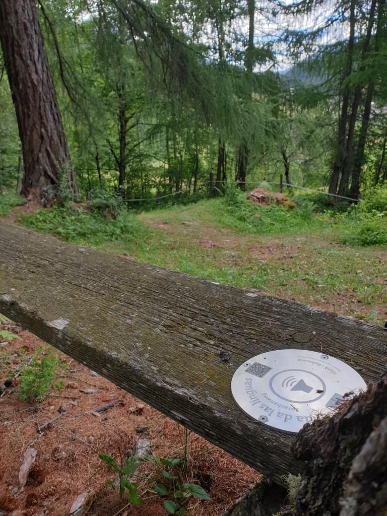 Ün bankin per sezzer e tadlar – üna da las staziuns audtivas da la senda da linguas inaugurada in sonda a Valchava (fotografia: Benedict Stecher).