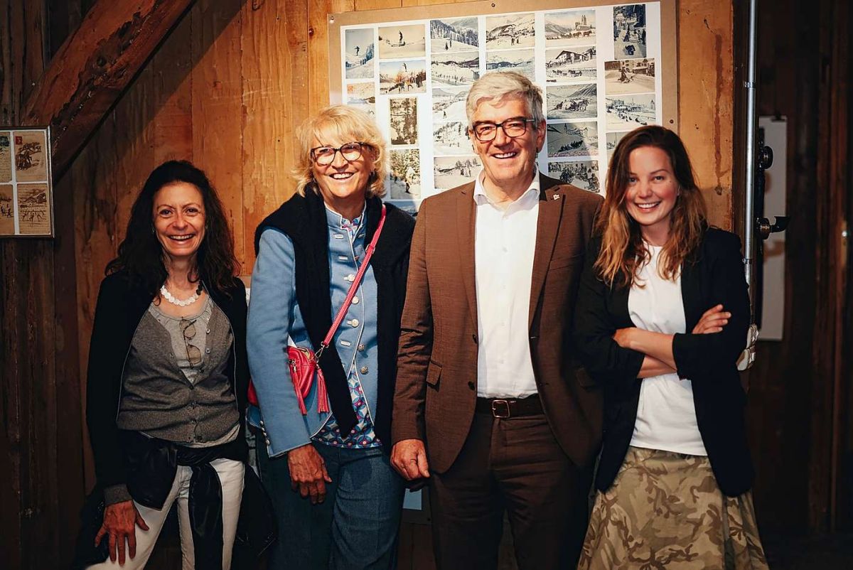 Die künstlerische Direktorin des Segantini Museums, Mirella Carbone, Sammlerin und Künstlerin Laura Ceretti, Regierungsrat Jon Domenic Parolini und Kuratorin Carolin Geist in der Ausstellung im Château Papillon. Foto: Château Papillon St. Moritz