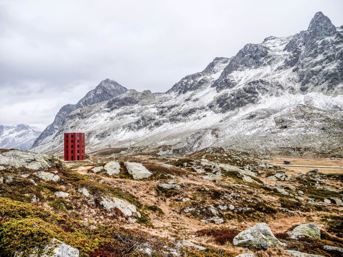 Der Origen-Theaterturm auf der Julier-Passhöhe als vergängliches Wahrzeichen. Foto: Jon Duschletta