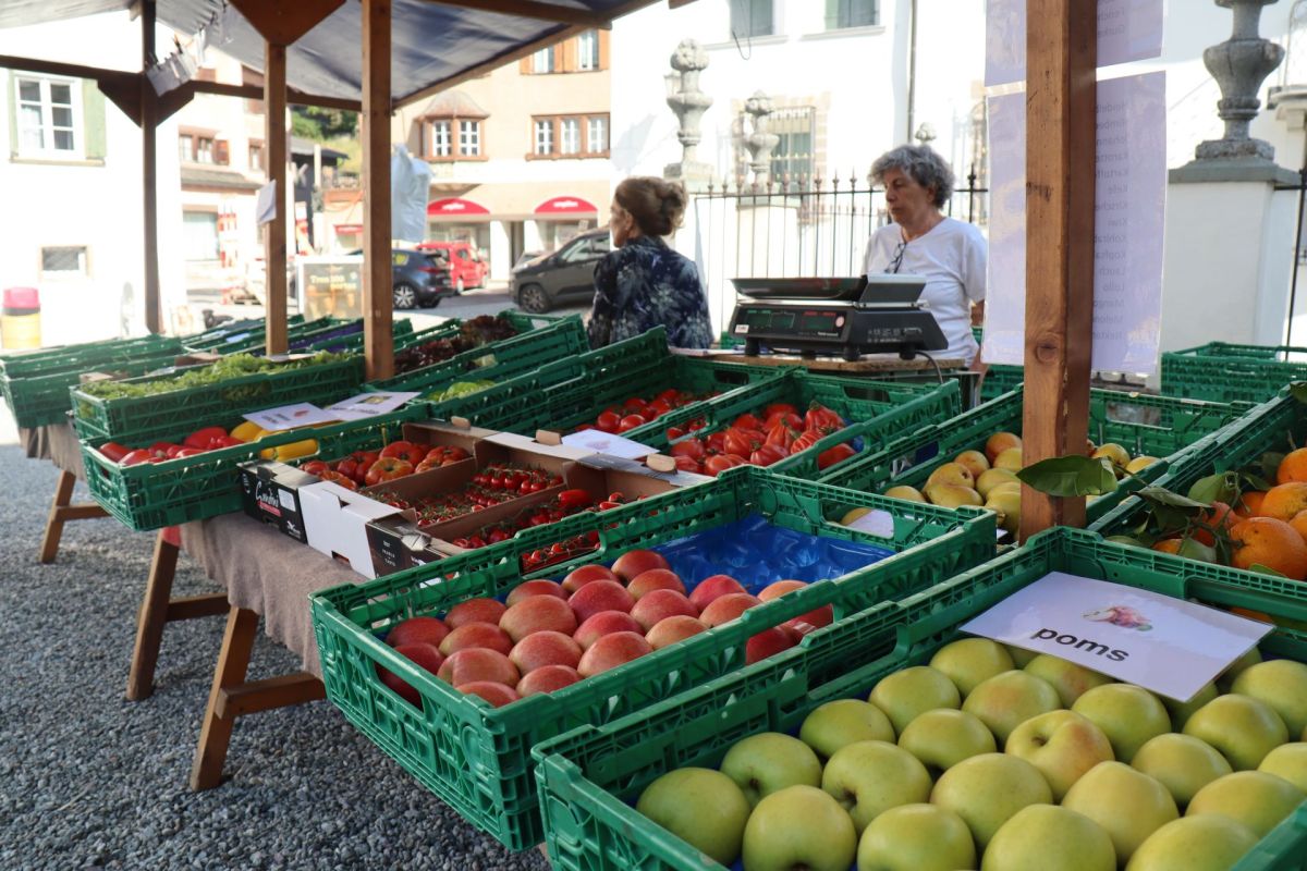 Sper divers prodots, specialiteds e regalins, vain eir spüerta verdüra e frütta al marcho eivnil da Samedan (fotografia: Martin Camichel).
