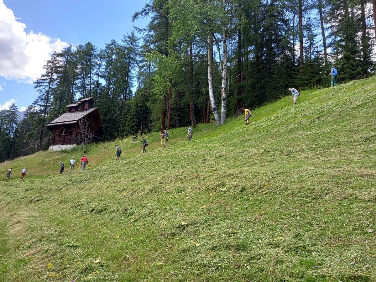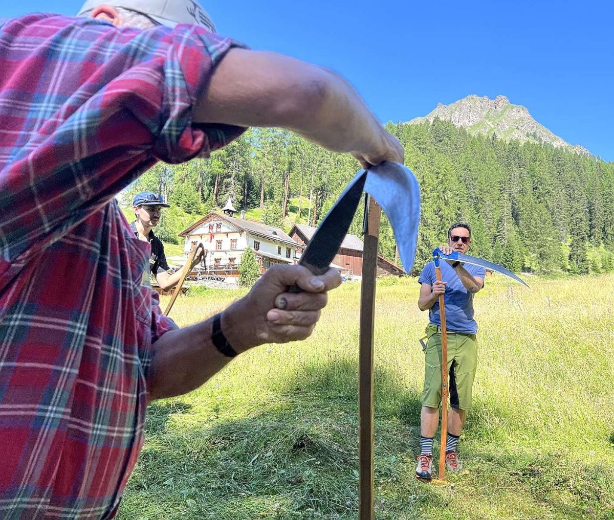 Am Samstag feierte Peter Berry zusammen mit den motivierten Teilnehmenden des von Domenic Riatsch organisierten Mäh- und Denglerkurses die Einweihung des renovierten Carillons in Hof Zuort.
