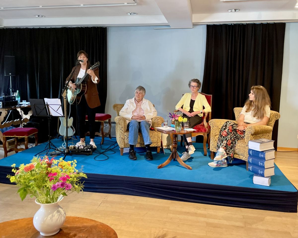 Las poetessas Anna Ratti, Rut Plouda e Jessica Zuan taidlan la cumposiziuns da Martina Linn cun giodimaint. Foto: Fadrina Hofmann