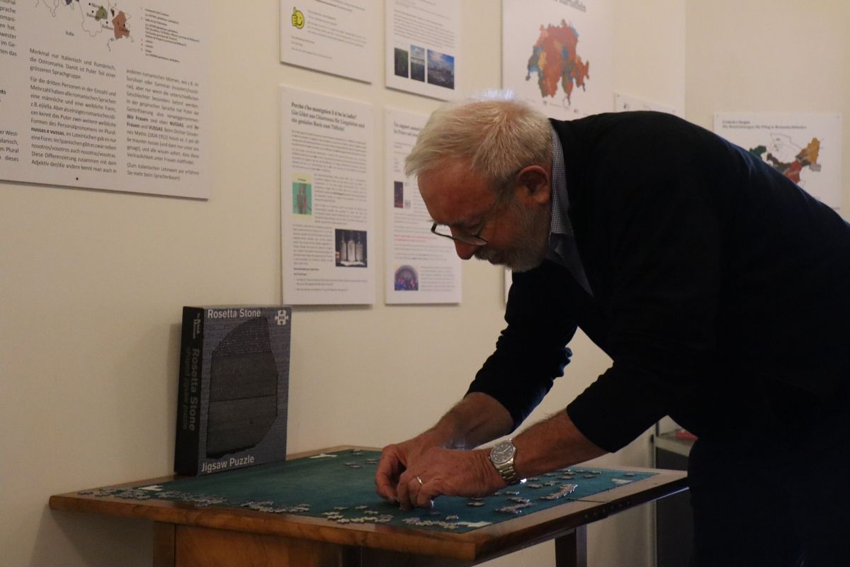Il linguist Chasper Pult a metter insembel il puzzle dal Rosetta Stone. Üna tela üsaglia druvess que tenor el eir per decoder il retic (fotografia: Martin Camichel).