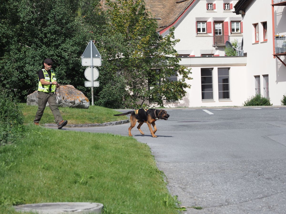 Der Personenspürhund führt den Hundeführer von der Geruchsaufnahme den Trail entlang, welcher der Vermisste gegangen ist. Dabei interessiert den Hund nur die Belohnung, welche er am Ende erhält, den Vermissten ignoriert er danach. Fotos: Nicolas Binkert