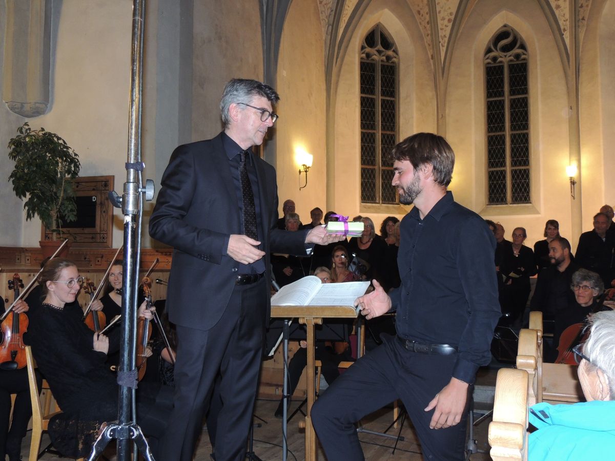 Curdin Lansel surdà la bachetta ed ün regal a seis successur Marcel Heis. fotografia: Benedict Stecher