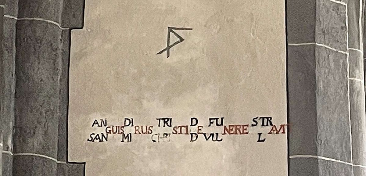 Steinmetzzeichen Bernhard von Puschlavs (oben) und Vexierschrift von 1522 (unten). Zu sehen in der Kirche von Ramosch. Foto: Walter Isler