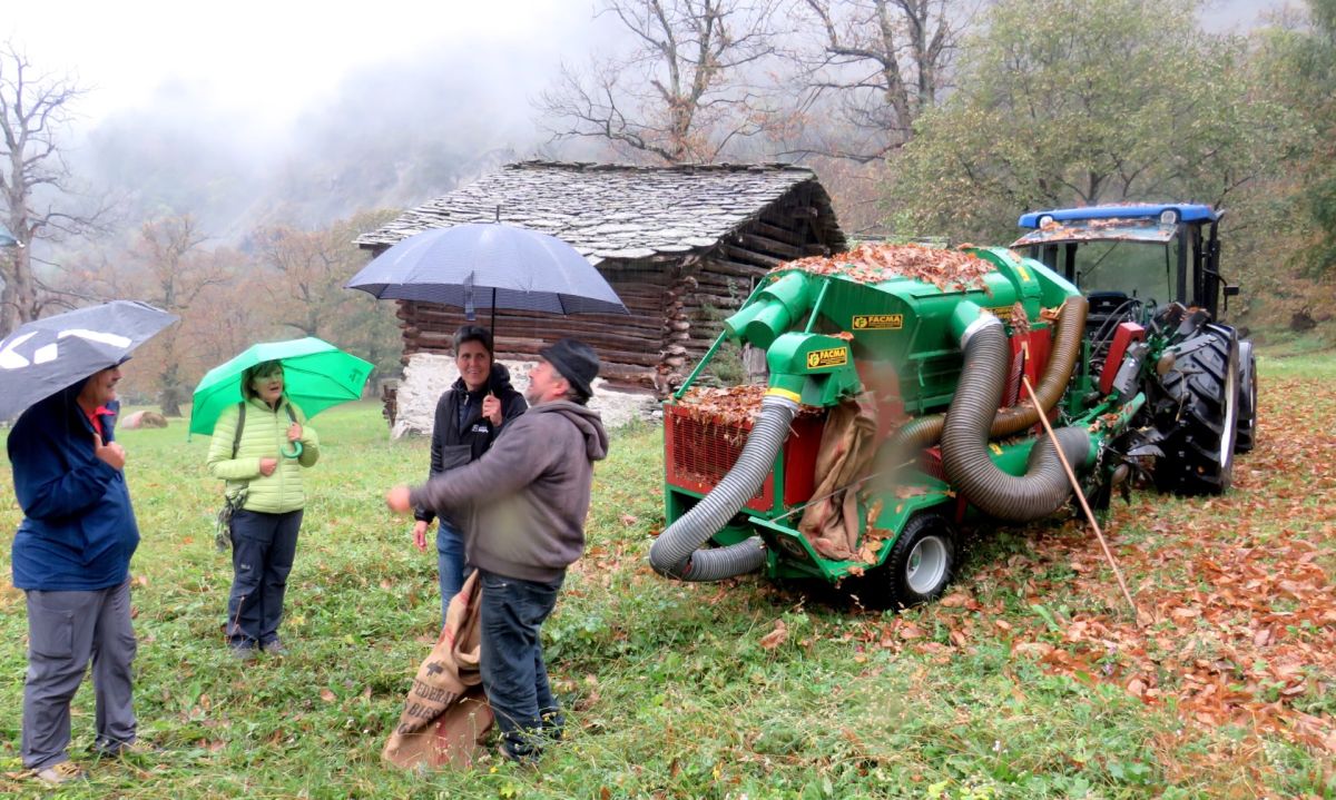 Renato Andreoli erklärt die Funktionsweise seiner Kastanien-Sammelmaschine ob Brentan. Foto: Katharina von Salis
