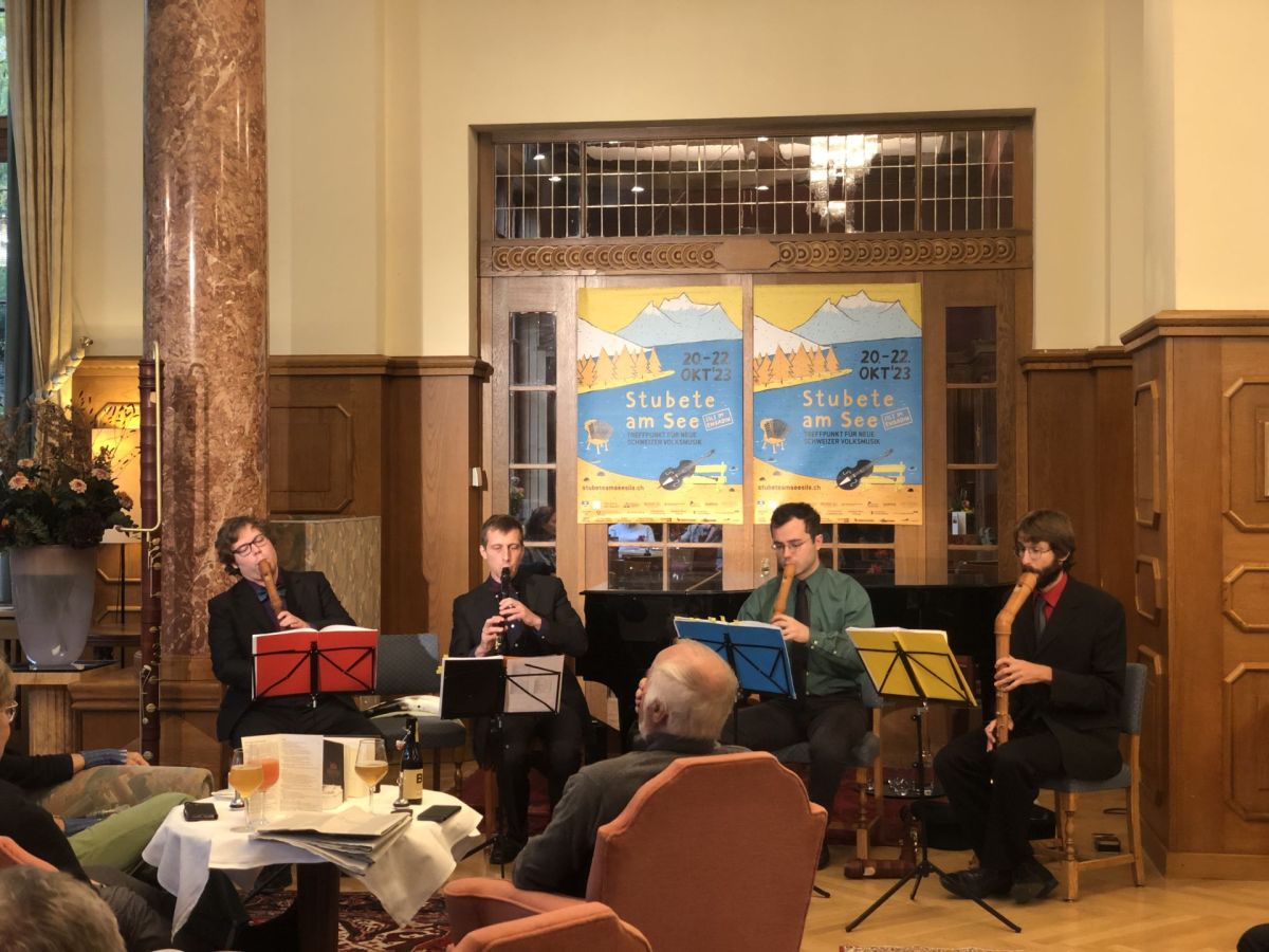 Eines der Ensembles, die an der Silser Stubete das Publikum verzückten: Die Flötenorgel bei ihrem Auftritt im Hotel Waldhaus. Foto: Marie-Claire Jur