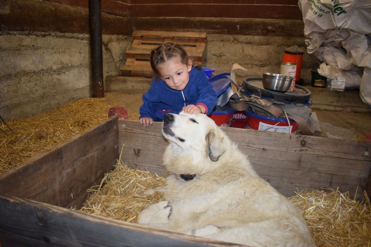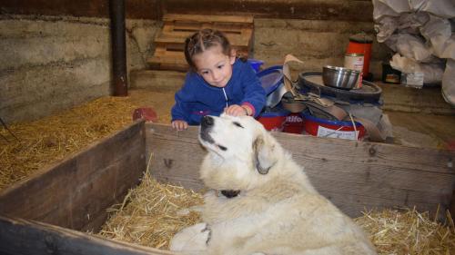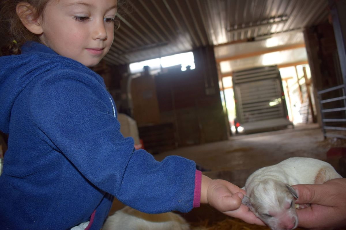 Amélie hat die grossen Hunde jetzt genug gestreichelt. Sie sucht ihr Lieblingsschaf «Pinkie». Es trägt eine farbige «9» auf dem Rücken und eine Schelle um den Hals. Pinkie gehörte gewissermassen auch zum Ausbildungsteam für die Schutzhunde. Denn diese wachsen von Anfang an gemeinsam auf: Lämmer und Welpen. Bald wird Amélies Vater 5 Lämmer aussuchen und sie in den Stall gleich neben Floras Wurfbox bringen. Die Box werden die Welpen schon bald verlassen. Sie werden den Geruch der Schafe aufnehmen und deshalb gut lernen, wen sie später einmal bewachen werden.