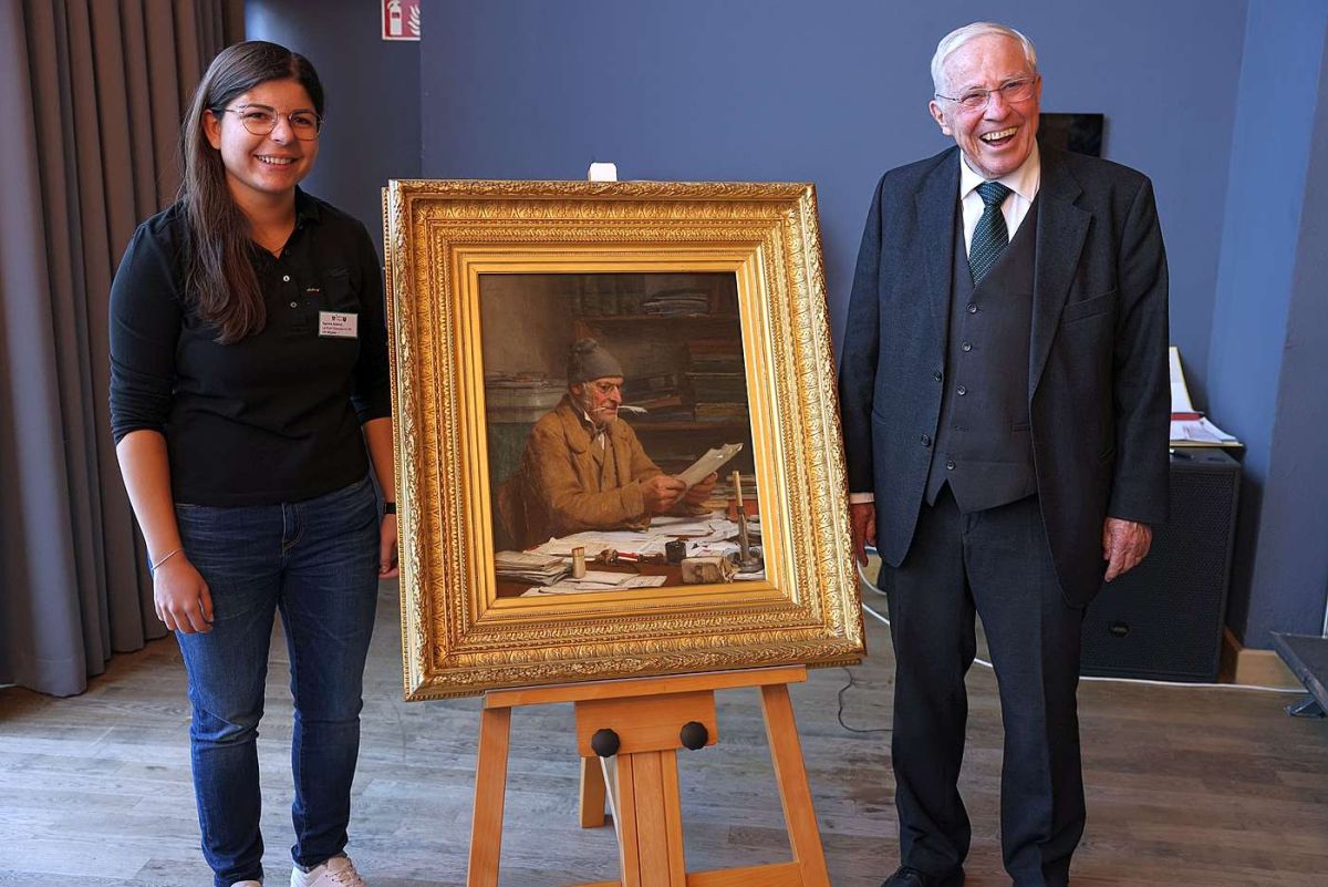 Vorstandsmitglied Egzona Zyberaj und Christoph Blocher posieren mit «Der Gemeindeschreiber» von Albert Anker Foto: slushhill