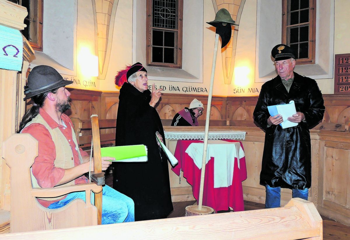 Il Wilhelm Tell – prelet e giovà d’üna gruppa ad hoc (da schnestra Dario Fallet, Annalisa Comps, Jessica Fliri e Josef Tschenett) – ha diverti (fotografia: Benedict Stecher/FMR)