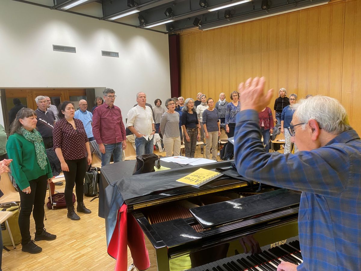 Il dirigent Jachen Janett ed üna part dal cor pro la penultima prouva in sonda passada a Sent (la terza da schnestra es la solista Sara Bigna Janett, la figlia dal dirigent). (fotografia: Flurin Andry)