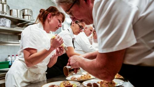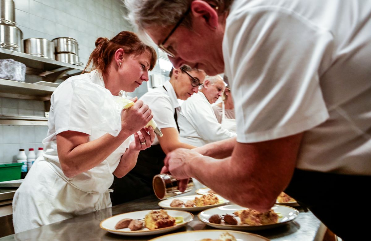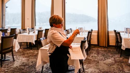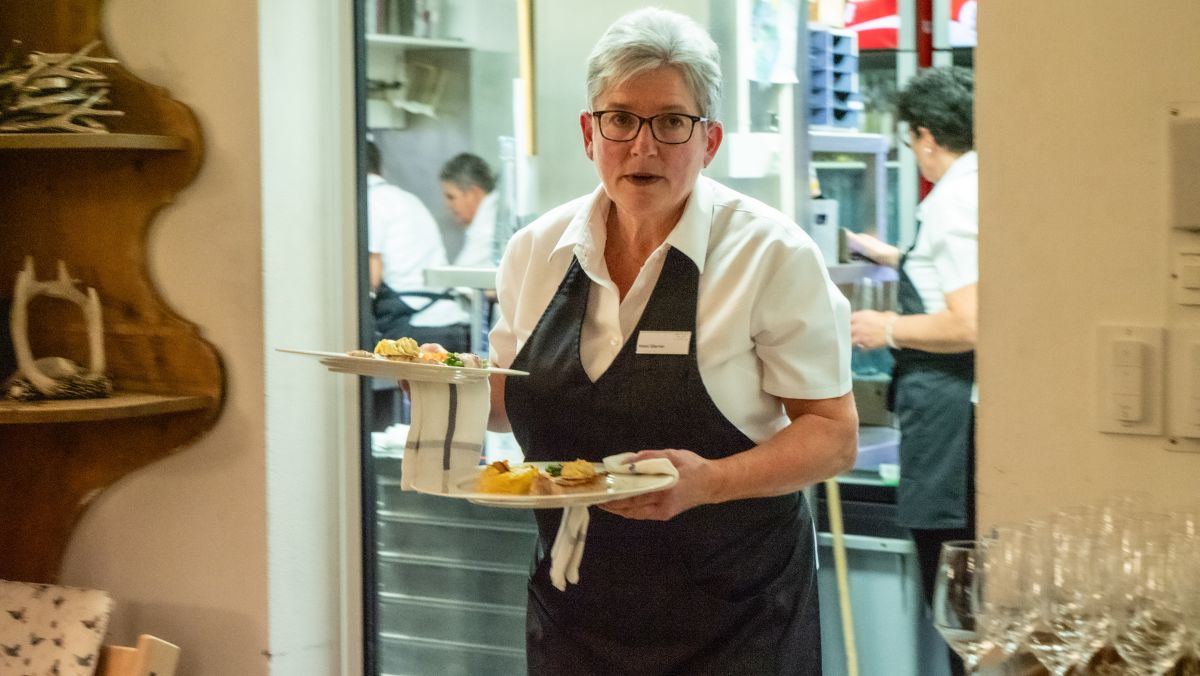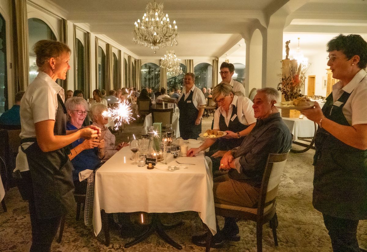«... 71, 72, 73!» Zum zweiten Mal schon zählen zwei Milchbäuerinnen die weissen Gedecke im dezent beleuchteten Speisesaal vom Hotel Waldhaus am See durch. Jetzt endlich stimmt alles. Derweil begrüssen die Rezeptionistin und zwei Bäuerinnen die ankommende Gäste, zwei andere stehen hinter der Bar und servieren erste Getränke, wieder andere hantieren in der Hotelküche und bereiten dort Apéro und das Drei-Gänge-Menü vor.