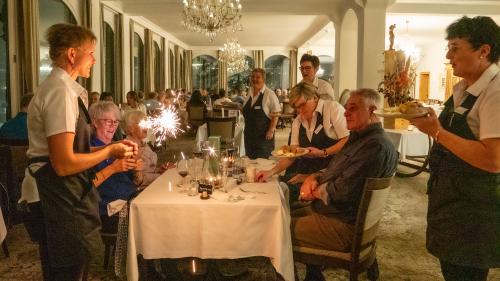 Zurück im Hotel, wo die Hektik unter den Milchbäuerinnen zunimmt. Sie servieren Apérogetränke und -häppchen, eilen mit frischen Getränken durch die Lobby, räumen hier und dort leeres Geschirr weg und haben trotzdem immer und überall ein offenes Ohr und einen flotten Spruch bereit. Sie weisen den Gästen ihre Tische zu, nehmen Getränkebestellungen auf und auch sie applaudieren dem Alphorn Ensemble zwischen den Stücken.