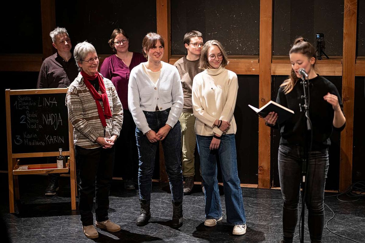 Karin Jundt (schnestra) düraunt ils Poetry Slam Engiadinais a Zuoz, chi’d es gnieu modero da Giann Duschletta (al microfon) (fotografia: Mayk Wendt).