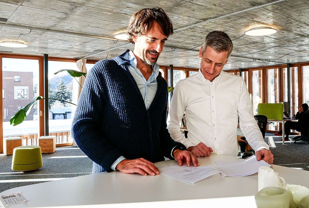 Caspar Coppetti (links) und Jon Erni freuen sich über die Baubewilligung für den InnHub La Punt. Foto: Jon Duschletta